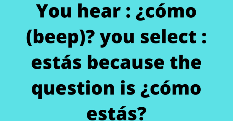 In this article,we will share You hear : ¿cómo (beep)? you select : estás because the question is ¿cómo estás?.Who's there? I hear: How are you doing?! I know this might sound strange but...can … [Read more...] about You hear : ¿cómo (beep)? you select : estás because the question is ¿cómo estás?